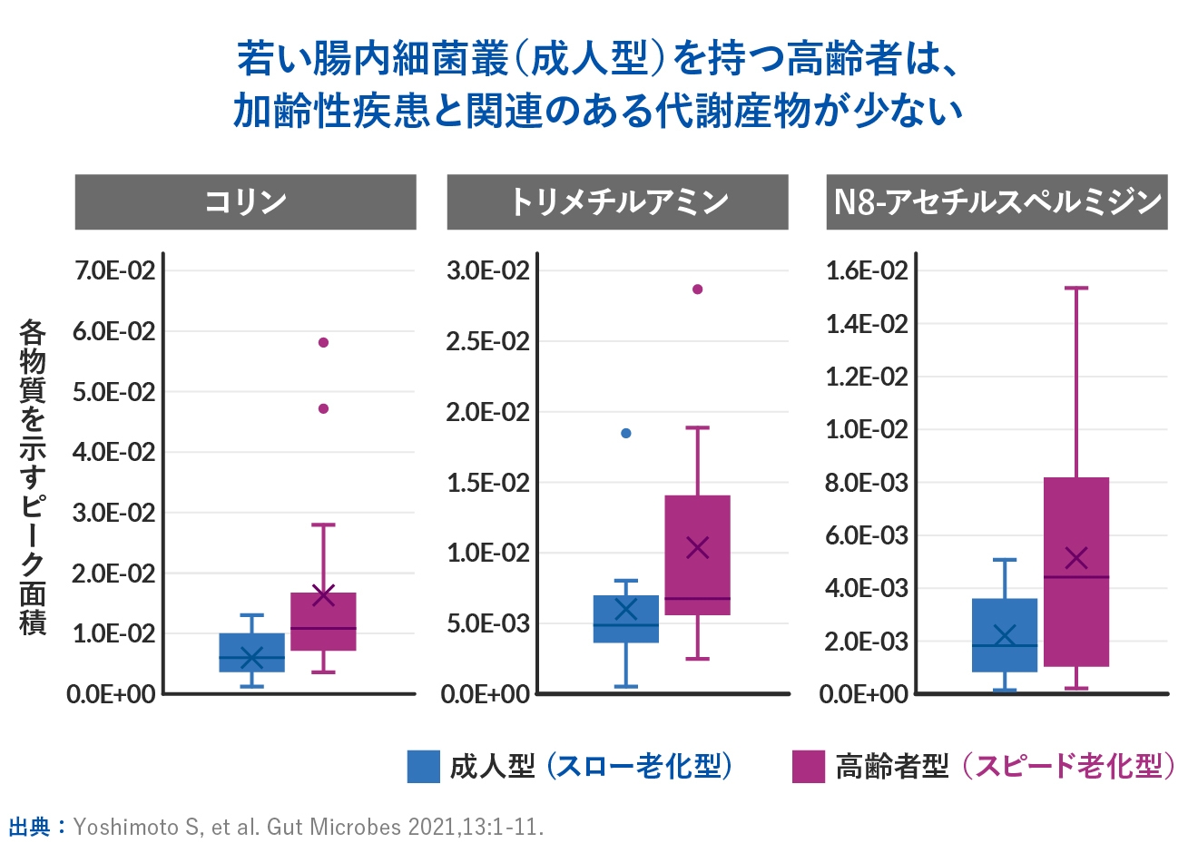 一般的に健常者の腸内細菌バランスは加齢とともに変化します。日本人の場合、乳幼児で最も優勢なアクチノマイセトータ門(ビフィズス菌等)は成長とともに減少し、高齢になると有害な菌が増加する傾向があります。しかし、若い人と類似した成人型の腸内環境の高齢者も存在し、腸内細菌叢が成人型の人は高齢者型の人と比較すると、加齢性疾患と関連のある代謝産物が腸内に少ないことが確認できました。つまり、高齢でも腸内細菌叢のパターンが若ければ、加齢性疾患になりにくいと考えられます。こういった研究結果から、腸内環境を若返らせれば生物学的に若返る可能性が考えられます。