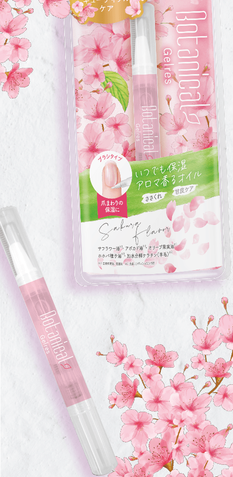 「ジェリスアロマキューティクルオイルペン〈サクラ〉」は植物由来の成分をコンセプトにした、さらっとしたネイルオイルです。肌なじみの良いホホバオイルを始め、植物由来のオイルをブレンドしました。