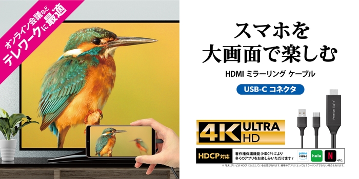 また、著作権保護機能(HDCP)対応により多くのアプリをお楽しみ頂けます。デバイスとテレビを繋ぐだけの簡単接続設計で、ミラーリング中も充電が可能です。