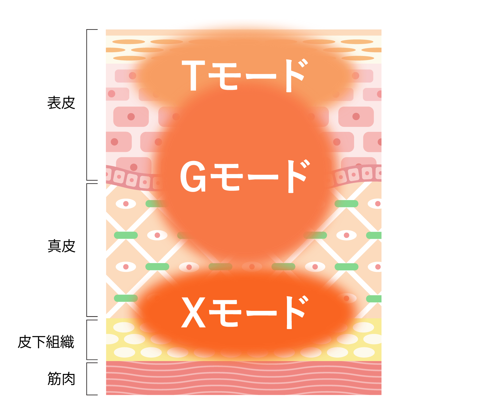 図のように3層で熱を加えていきます。全体に照射できることがメリットです。施術後も皮膚の中に熱が溜まった感覚が続きます。熱が続くことでコラーゲンやエラスチン増生に繋がります。