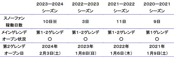 シーズンごとのスノーファン稼働日数表