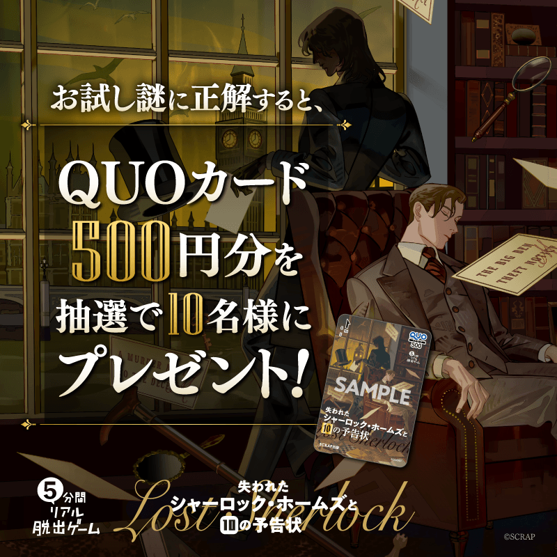 また、お試し謎に正解し結果をSNSでシェアすると表紙デザインのQUOカードが当たる「お試し謎キャンペーン」や、皆さんからの犯行予告風の謎を募集する「予告状謎コンテスト」を開催いたします。どちらも詳細は特設サイトもしくはSCRAPマガジンおしらせページよりご確認ください。