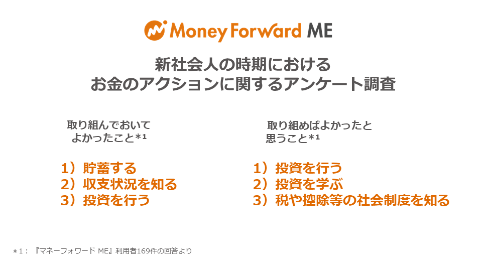 先輩社会人の『マネーフォワード ME』利用者の声から、新社会人の時期に取り組みたいお金のアクションは、投資などの資産形成を見据えた貯蓄と、そのための日々の収支状況の明確化、また早期に資産形成の動きが取れるような知識の吸収がポイントと言えそうです。