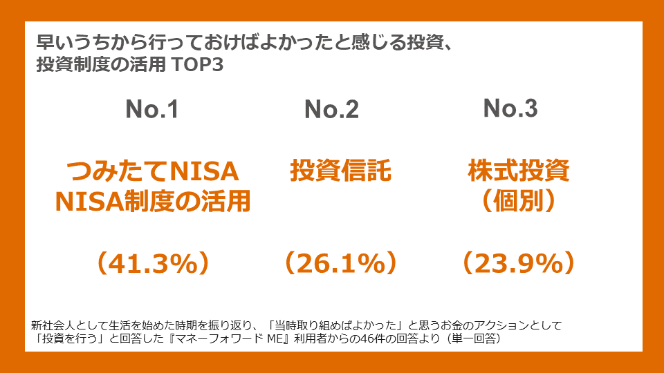新社会人の時期に取り組めばよかったと思うお金のアクションに「投資を行う」と回答した方が、実際に早いうちから行っておけばよかったと感じる投資、投資制度の活用についても調査しました。「つみたてNISA、NISA制度の活用(41.3%)」「投資信託(26.1%)」「株式投資(個別)(23.9%)」がTOP3に挙がる結果となりました。