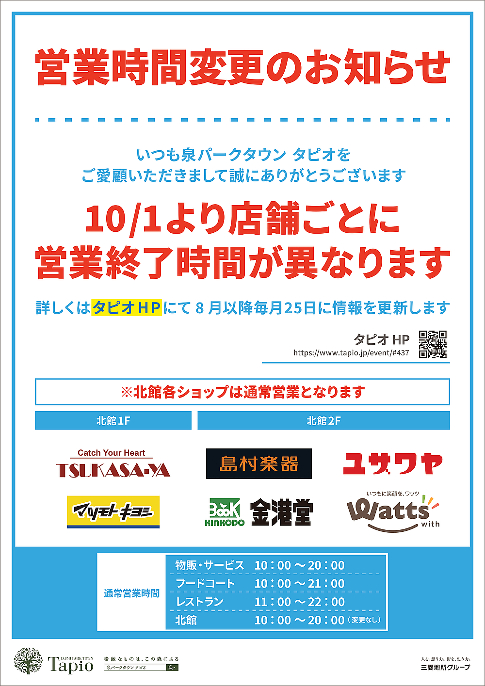 仙台市泉区「泉パークタウン タピオ」 出店店舗の働きやすさや満足度向上、サステナブルな運営を目指し 【営業時間フレックスタイム制】を導入開始