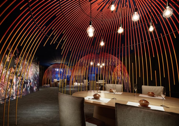 夕食は、花火に包まれた気分で味わう「和食ダイニング 花火」での会席料理です。本プランでは、キャビアとゆず、山葵を最中にのせた「キャビア最中 豆乳サワークリーム ゆずと山葵風味」を特別に提供します。西洋料理での使用が多いキャビアを、ゆずや山葵、最中と合わせ、和テイストに仕上げた一皿です。大豆からつくったクリームを泡立てた豆乳サワークリームが、キャビアの味を引き立てます。日本酒と一緒に味わうのがおすすめです。