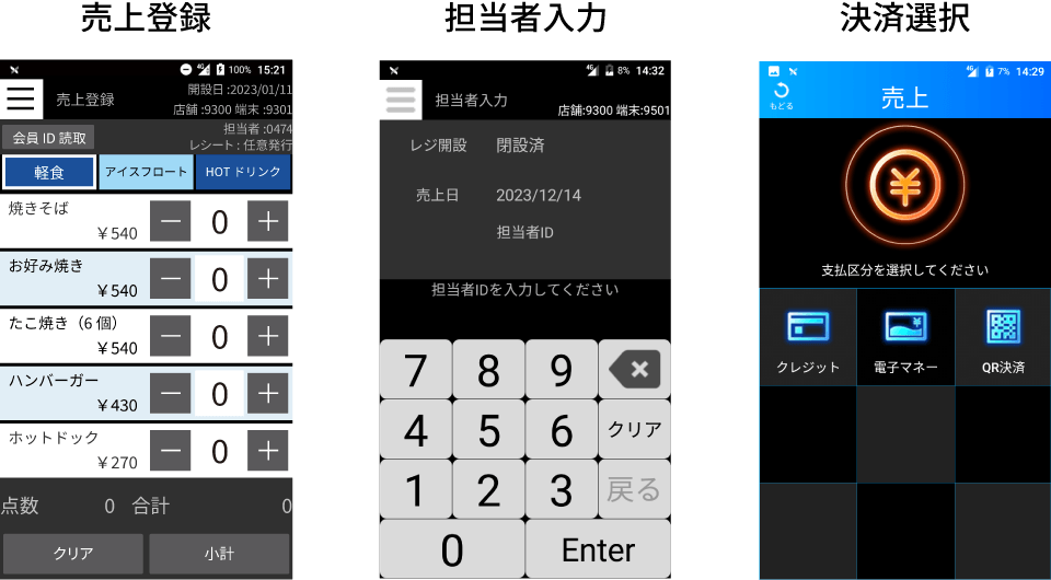 決済機能・レシートプリンタ・カメラ一体型ボディで、現金・クレジット・電子マネー・コード決済等、さまざまな決済手段に対応します。