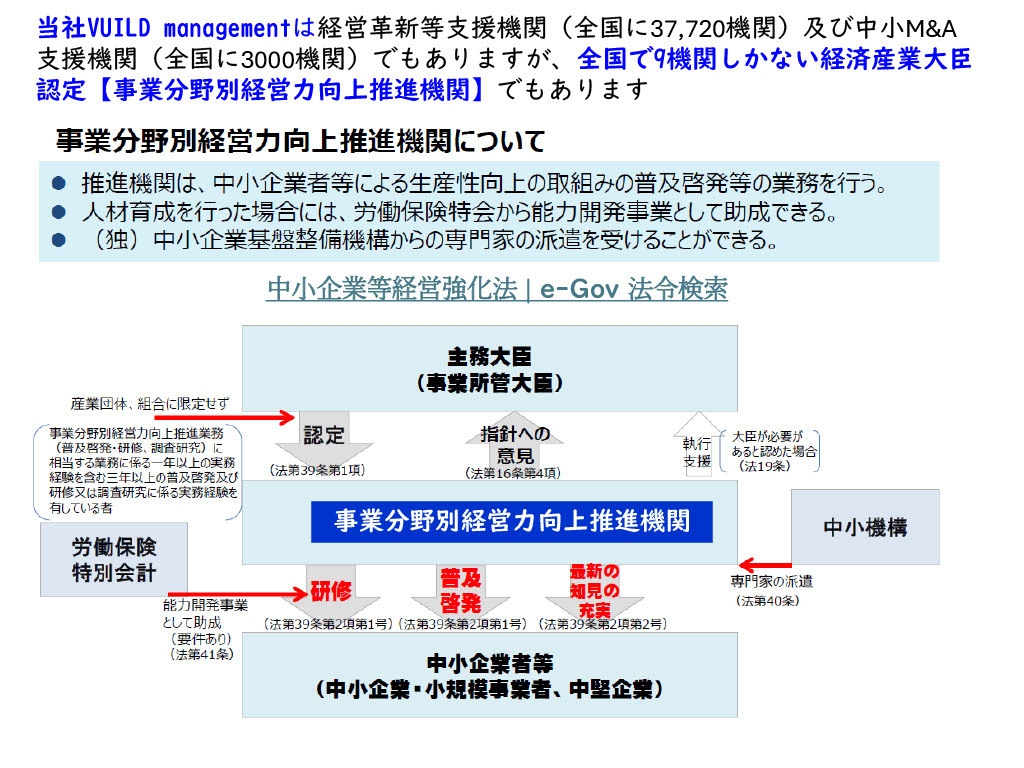 株式会社VUILD managementは、中小企業等経営強化法第26条に基づき、経済産業大臣から認定された「事業分野別経営力向上推進機関」(全国で9機関のみ)であり、中小企業に精通した専門機関として「中小企業の本気の賃上げ」実現の為に直接政府及び省官庁に提言書提出等の活動をしています。