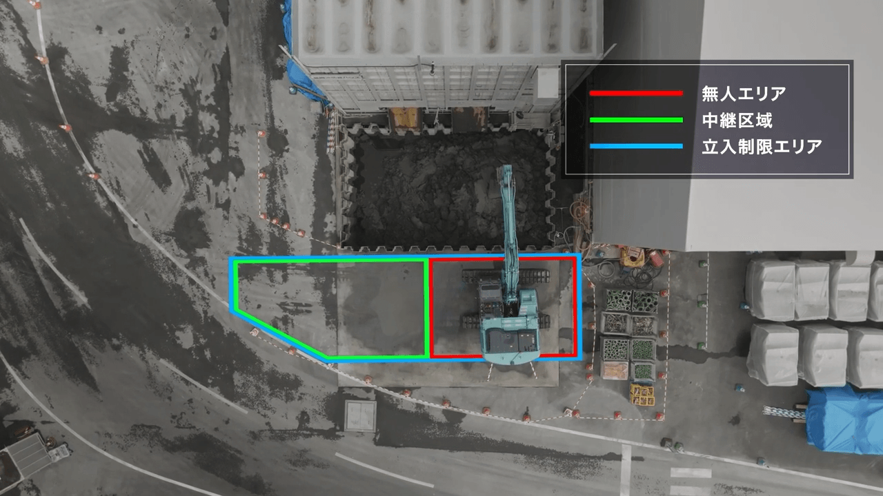 国土交通省の「自動施工における安全ルールVer.1.0(注4)」に沿ってリスクアセスメントを実施し、無人エリアや中継エリア、立ち入り禁止エリアなどを設定しました。無人エリアでは、「K-DIVE(R)」による遠隔操作と自動運転を組み合わせて無人作業を実現させました。