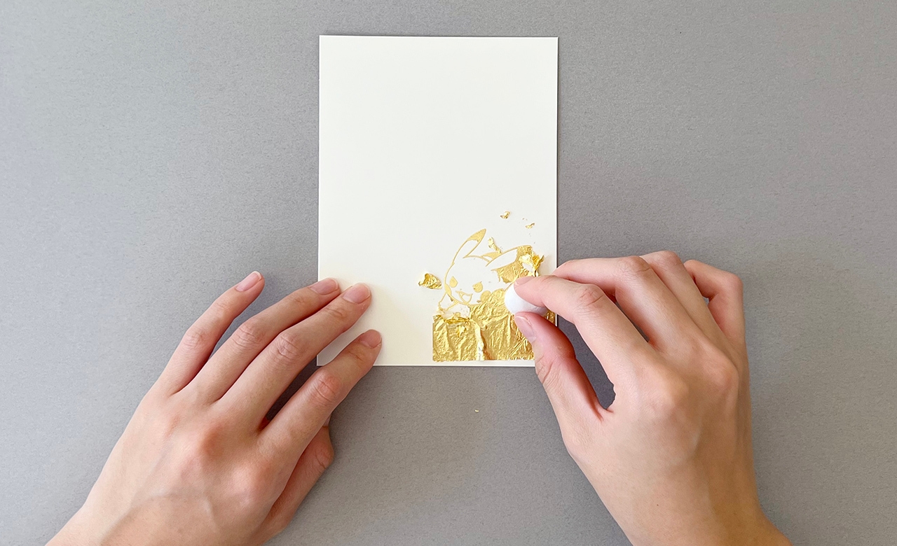 ハガキにはデザインされたピカチュウの接着剤が事前についていますので、金箔を貼り付け、コットンで余分な金箔を剥がすだけで小さなお子様でも簡単にピカチュウの金箔ハガキが作れる体験です。お土産としてお持ち帰りもしていただけます。