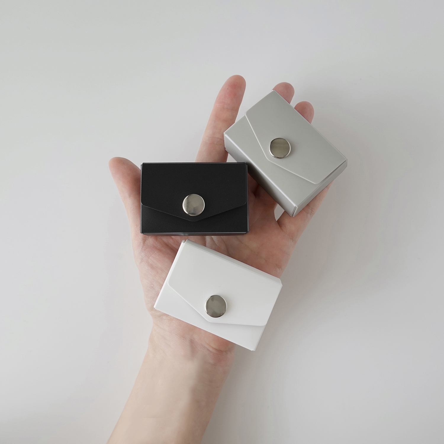 フラップ(フタ)が大きく開き細かい物の出し入れがしやすい設計で小物の整理に役立ちます。手のひらに収まるほど小さなケースですが、全体の大きさとボタンのバランスを考えシンプルに仕上げた事で散らかりがちな小物をすっきり見せる工夫をしています。