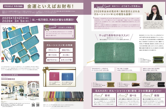 有限会社スタイルコム(本社:東京都台東区、代表取締役社長:谷本 貴義)が展開するガルーシャ(エイ革)専門ブランド「バハリ」は、CREA2025年12月5日(金)発行号において、ぷりあでぃす玲奈さんをゲストとした「金運といえばお財布!」企画で紹介されました。