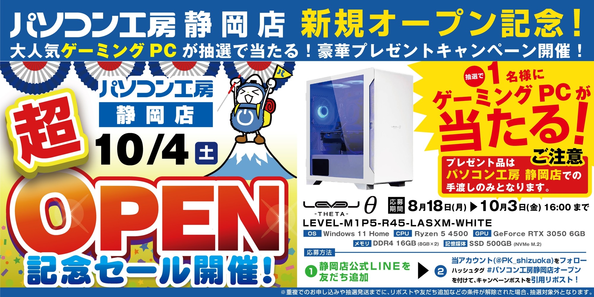 ■【パソコン工房 静岡店】新規オープンを記念して豪華プレゼントキャンペーンを開催