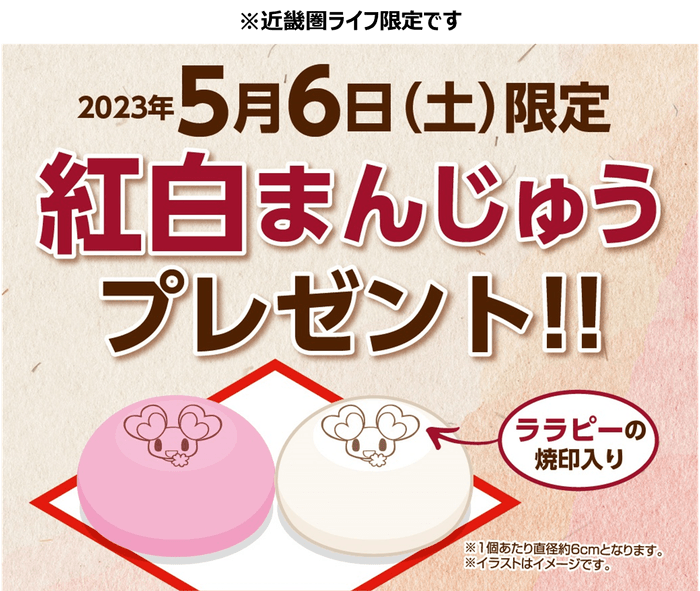 5月6日(土)のお買い上げ金額1,000円以上(税込)のレシートを、各店舗のサービスカウンターまでお持ちいただくと、先着順で「ララピーの焼印入り紅白まんじゅう」をお渡しいたします。なくなり次第、終了となりますのでご了承ください。