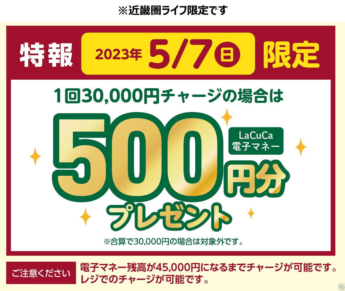 ③【5月7日(日)限定】電子マネー「LaCuCa」に30,000円チャージで500円プレゼント