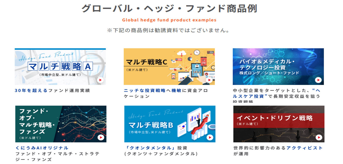 当社は、日本から海外著名ヘッジ・ファンドへの投資機会を提供するとの目標を掲げ、今後も日本で購入が難しい多彩なオルタナティブ投資商品を厳選して提供いたします。