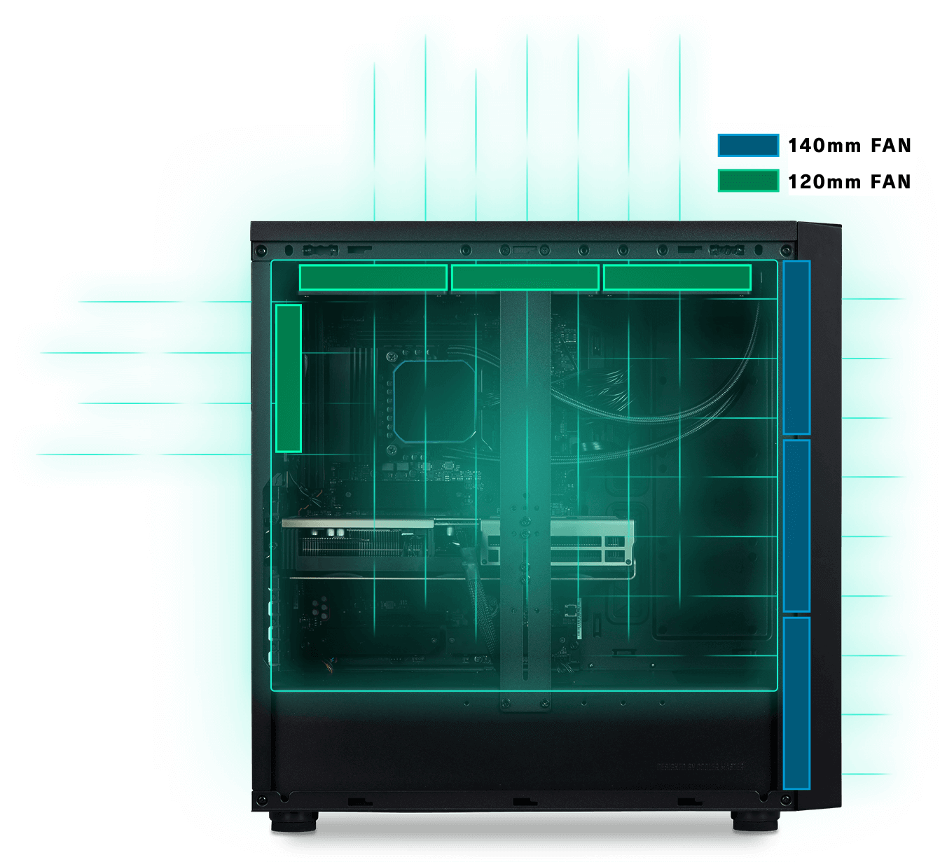フロントに140mmの大型ファン3基、リアに120mmファン1基を標準搭載しています。 内部のパーツを効率よく冷却するために、フロント吸気、トップ・リア排気を採用し、強力なエアフローを実現します。