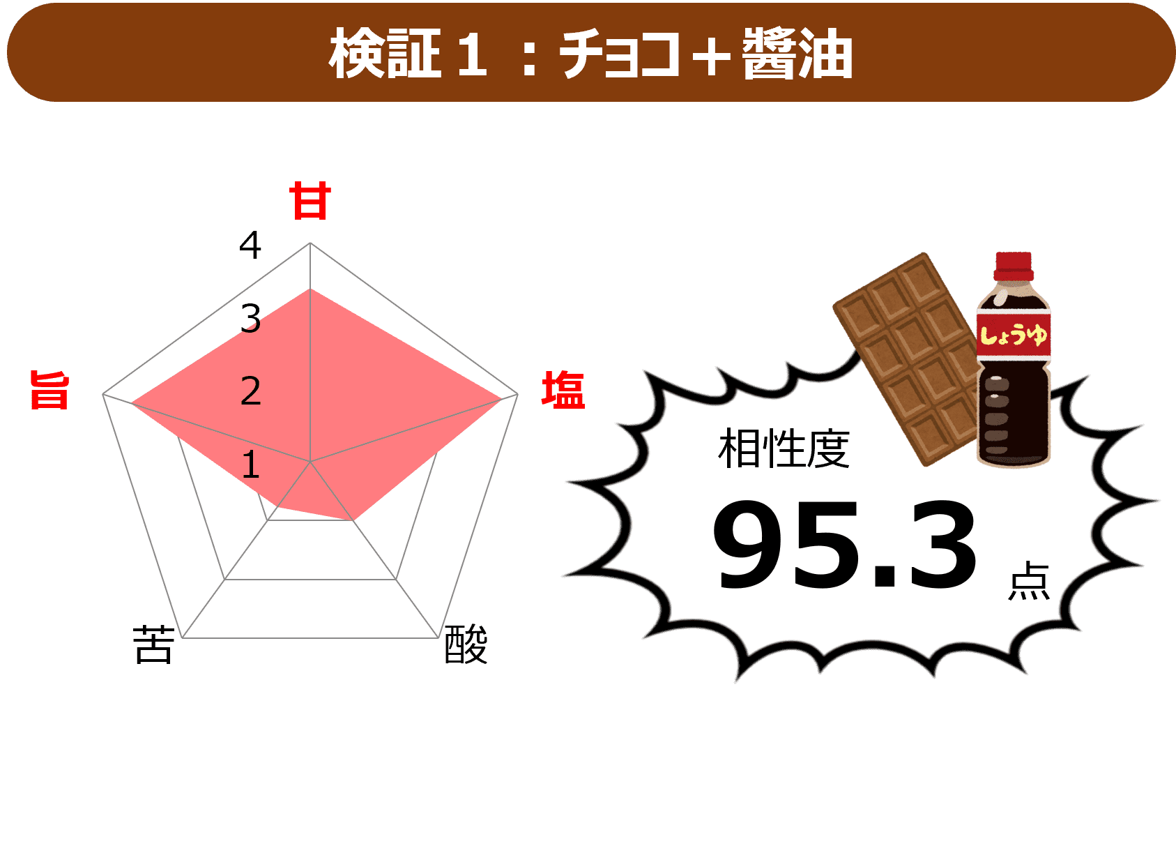検証の結果、「醤油」「味噌」とチョコレートの組み合わせは、チョコレートと相性の良い代表格である「コーヒー」と同等の美味しい組み合わせであることが判明しました。また、味覚の基本五味のうち「甘味・旨味・塩味」のバランスが整っており、「ハンバーグ」「焼肉」「甘口カレー」などといった、子どもが好む「味覚の王道」を実現していることが分かりました。その結果を踏まえ、同じ大豆由来の発酵食品として「納豆」を検証したところ、「納豆」もチョコレートと相性度が高いことを発見しました。