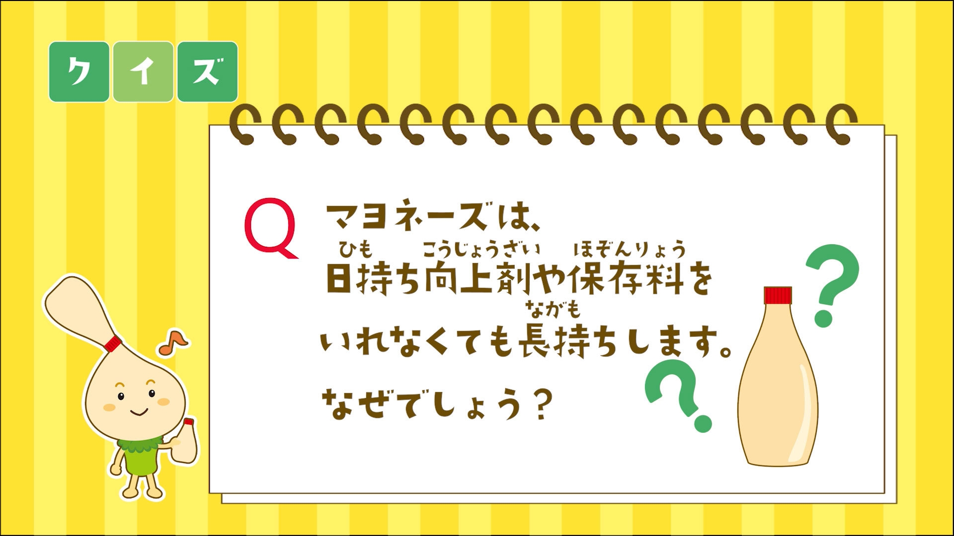 マヨネーズの製造工程を、マヨネーズのPRキャラクター「まよにぃ」と「ハカセ」がご案内します。『マヨネーズは何からできているの?』『乳化って何?』など作り方やポイント、SDGsに関連する取り組み、安全・安心な商品づくりなど、クイズを交えながら工場で商品ができるまでを楽しく学ぶ動画です。動画の理解をより深めていただくために、記入式(一部に穴埋め問題あり)の「学習シート」もご用意しました。ダウンロードの上ご活用ください。 (約14分)