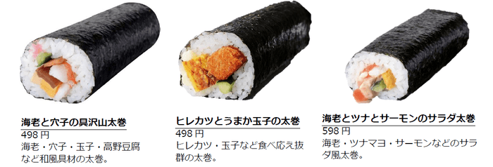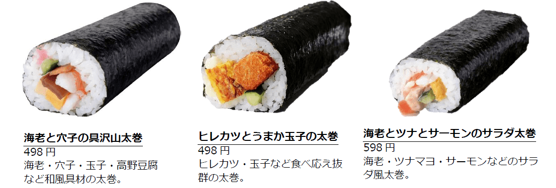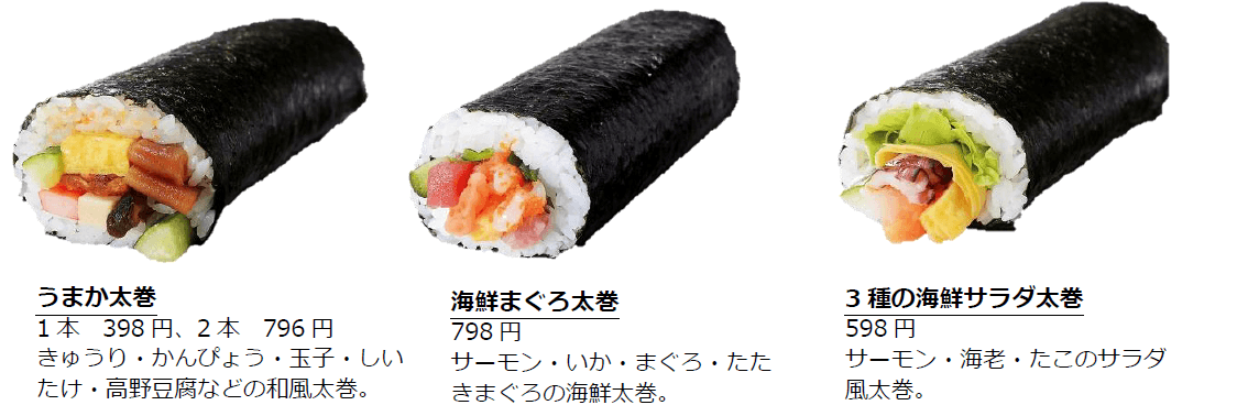 近畿圏ではきゅうり・かんぴょう・玉子・しいたけ・高野豆腐などこだわりの具材を使用した「うまか太巻」など最大24種類の恵方巻を、首都圏では北海道産帆立やまぐろなど8種の具材を使用した「北海道産帆立入り海鮮太巻」など最大10種類の恵方巻をバリエーション豊富に取りそろえます。