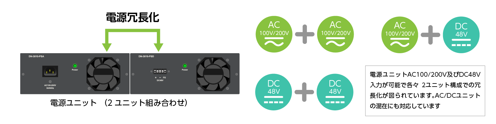 AC100/200V または DC48V の二重電源構成により、片系停止時でも安定した電源供給を維持。ACとDCの混在構成にも対応し、現場条件に合わせて柔軟に構成できます。