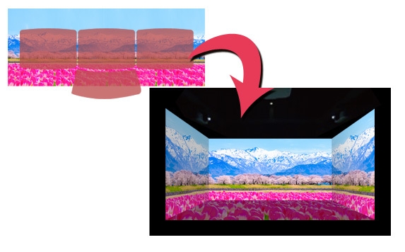 このシステムを使用すると、パソコン内で360度の全天周(8K~12K)のVR映像(実写・CG)を自動的に分割し、空間全体に映像を投影することができます。これにより、ヘッドマウントディスプレイを使用せず、複数の人が同時に、その場にいるような没入感のあるバーチャル体験を、手軽に楽しむことができるようになります。