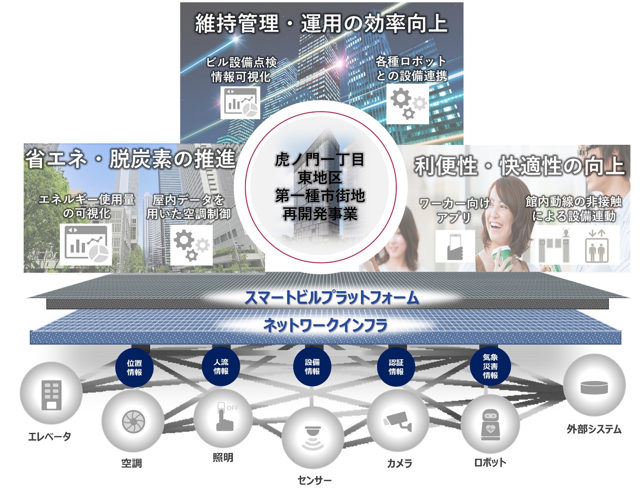 本事業では、スマートビルプラットフォームを中核とし、センサー類を接続するためのネットワークをはじめ、ビル内のさまざまな設備を連携させることで、「人」を中心に据えた次世代型ワークプレイスの創出とさまざまな社会課題解決に向けた取り組みを推進します。