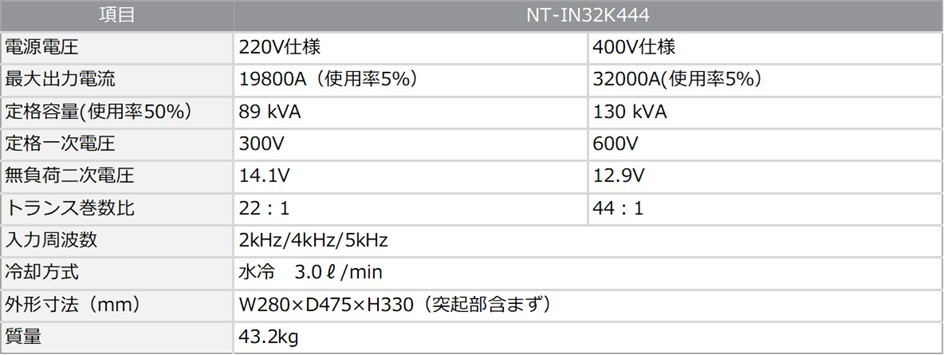 専用トランスNT-IN32K444(AC400V仕様)を使用することにより、最大32000A(使用率5%)の出力を得ることが可能です。大電流、長時間通電を必要とする大型モーターのコイルと端子のヒュージングや、銅など高伝導材料の溶接に適しています。