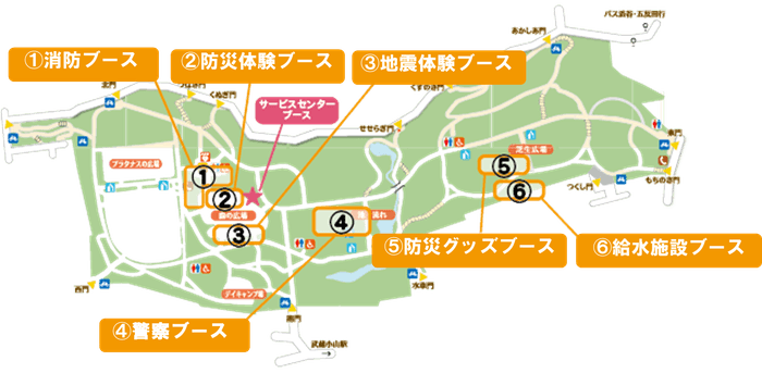 消防車の乗車体験ができるブースや地震を体験できるブースなど、楽しく防災を学べる様々なブースをご用意して皆さまをお待ちしております。また各ブースでミッションを達成してスタンプを集めていただくと、先着500名様に公園オリジナル缶バッチなどのグッズをプレゼントします!