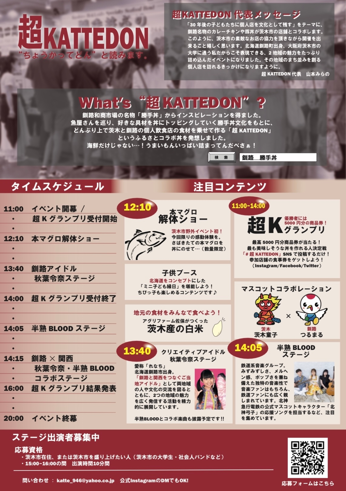 当日は、超KATTEDONを食した来場者にSNSで写真を投稿してもらい、“最もおいしい丼”を作れる人を決める「超 KATTEDON グランプリ」企画をはじめ、釧路と関西をつなぐご当地アイドルの秋葉令奈氏らの音楽ステージ、茨木市内の野外イベントで初となる本マグロの解体ショー、茨木のマスコット「茨木童子」や釧路のマスコット「つるまる」も登場します。
