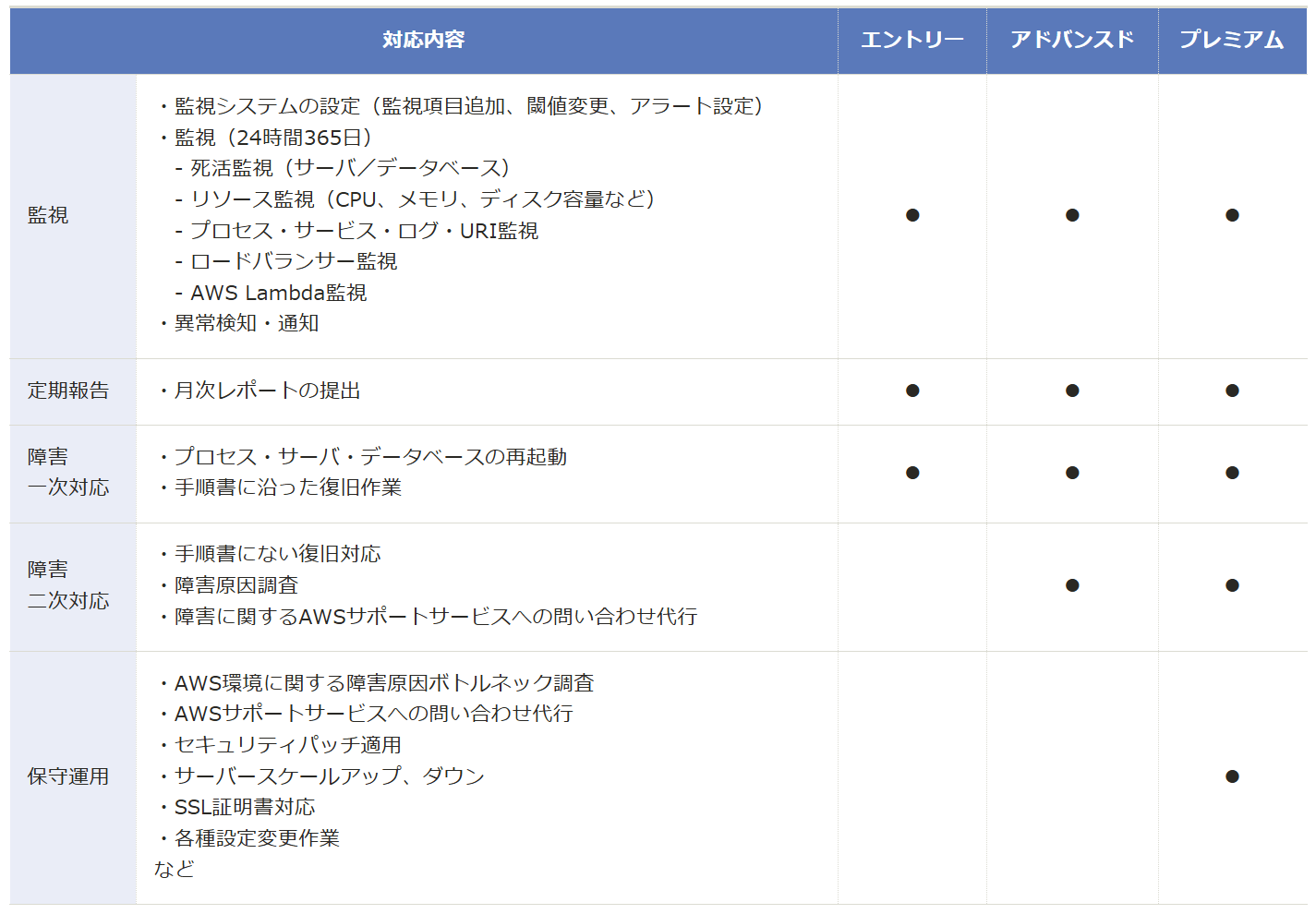 エントリープランのサービス内容に加え、障害時の二次対応としてリストアなどの復旧対応とサーバーログの取得、障害原因の調査、それに付随するAWSサポートサービスへの問い合わせ代行を実施