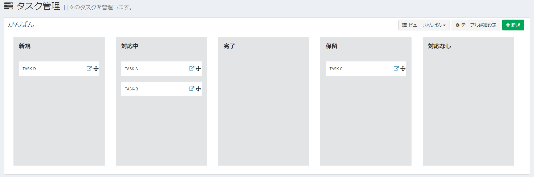 例えば、データを「かんばん」として表示するビューをプラグインとして作成できます。ドラッグ&ドロップによって、タスクのステータスを管理できます。