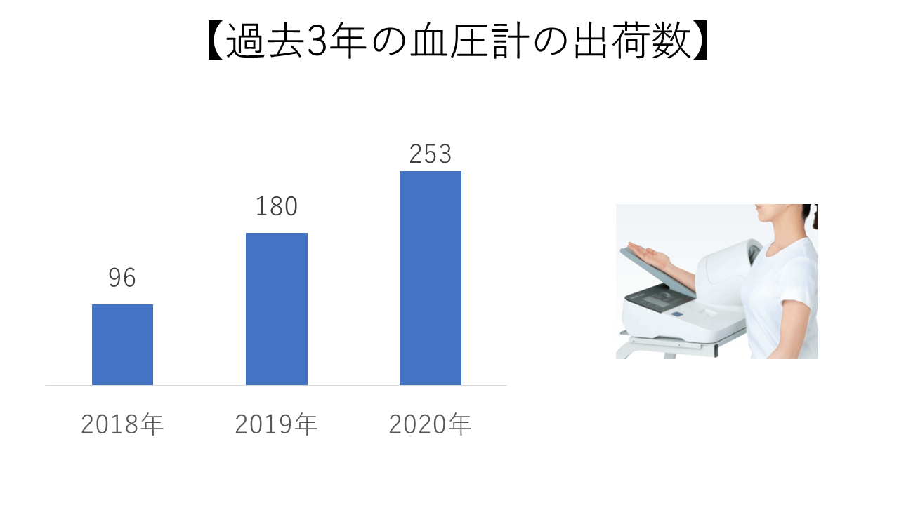 このような背景の中、点呼で使用することを想定した据置式の業務用血圧計の実績が着実に伸びてきています。過去3年(1-12月)の実績は以下となっています。