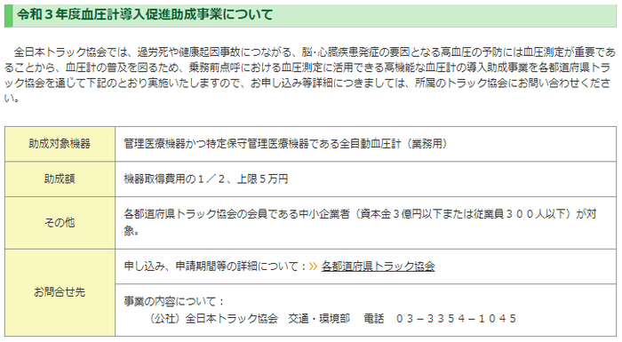 そしてこの度、4月9日、全日本トラック協会より、2021年度の血圧計の助成金開始されることが公表されています。補助率は 1/2、上限は5万円となっています。