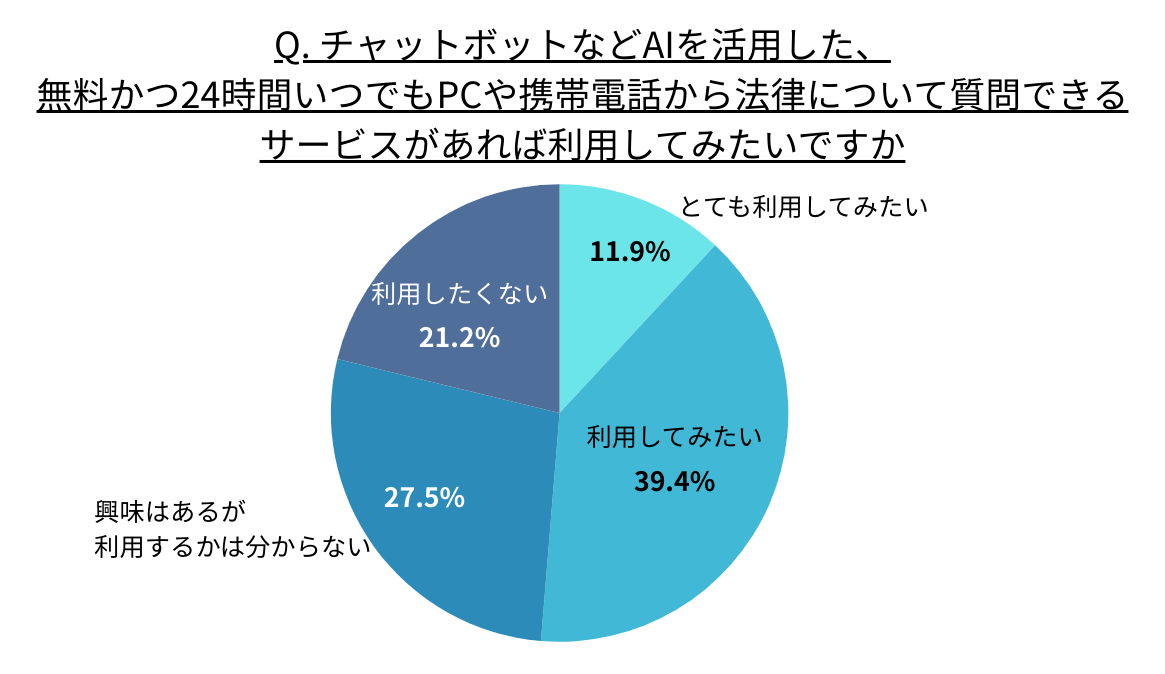 ・AIによる法律アドバイスサービスの利用意向:「とても利用したい」11.9%、「利用したい」39.4%