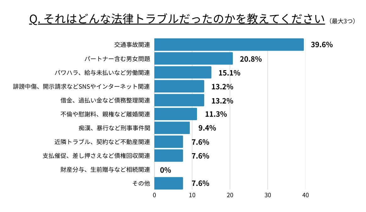 また、法律トラブルを抱えたことがあると回答した人に「それはどんな法律トラブルだったのか」を聞いたところ「交通事故関連(39.6%)」が最も多く、次いで「パートナーを含む男女問題(20.8%)」「パワハラ・給与未払いなど労働関連(15.1%)」となりました。