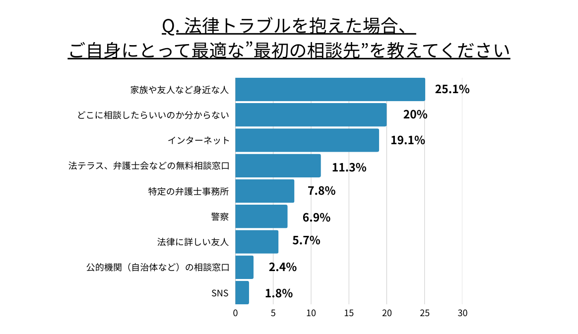 ・最初に相談する相手は「家族や友人」25.1%、「弁護士事務所」は7.8%