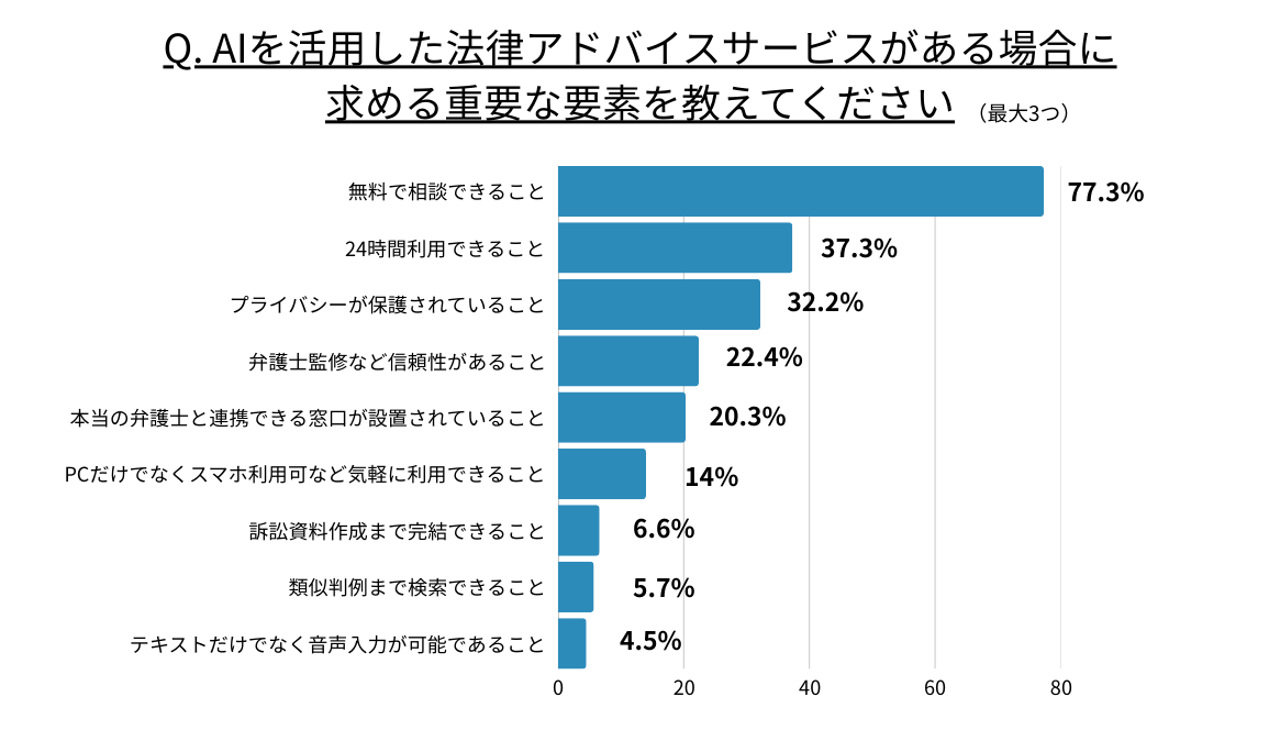 AIを活用した法律アドバイスサービスがある場合、「無料で相談できること(77.3%)」が最多となり、次いで「24時間利用できること(37.3%)」「プライバシーが守られること(32.2%)」が重視されることが分かりました。