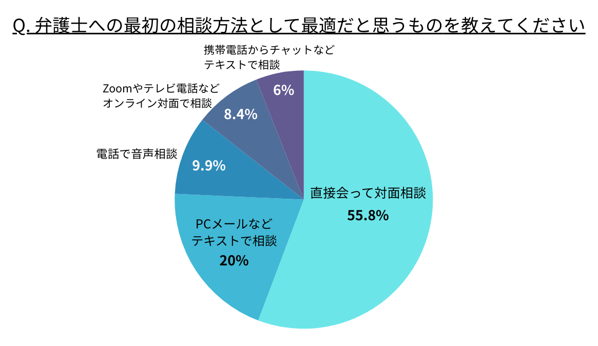 弁護士への最初の相談方法については、依然として「直接会って相談」が55.8%と最多でした。しかしながら、「PCやスマホなどメール・チャットのテキストで相談(26%)」、「電話で相談(9.9%)」、「オンラインでの対面(8.4%)」と、非対面での相談ニーズも確実に存在しており、より相談しやすい環境が求められていることが分かりました。