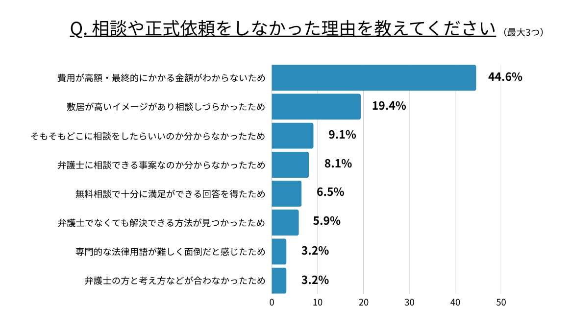 ・弁護士に相談しなかった理由:1位「費用が高額・不透明」44.6%