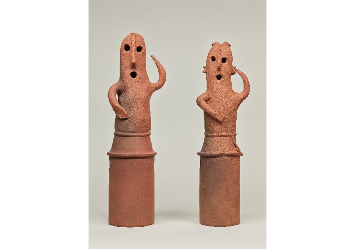 小さい方の埴輪は、腰に鎌を着け、顔の両脇で髪を結って束ねる美豆良(みずら)という男子の髪型をしています。一方、大きい方の埴輪にはその特徴がみられず、男女のどちらかよくわかっていません。ただ、女子の埴輪によくみられる胸部や服飾の特徴的な表現がないことから、男子の埴輪であるとも考えられています。衣服や武具、アクセサリーを身に着ける埴輪も多くありますが、この作品はどちらの衣装も帯のみと大胆にデフォルメされています。この素朴さ、そして生き生きとした動きが作品の魅力でもあるのではないでしょうか。