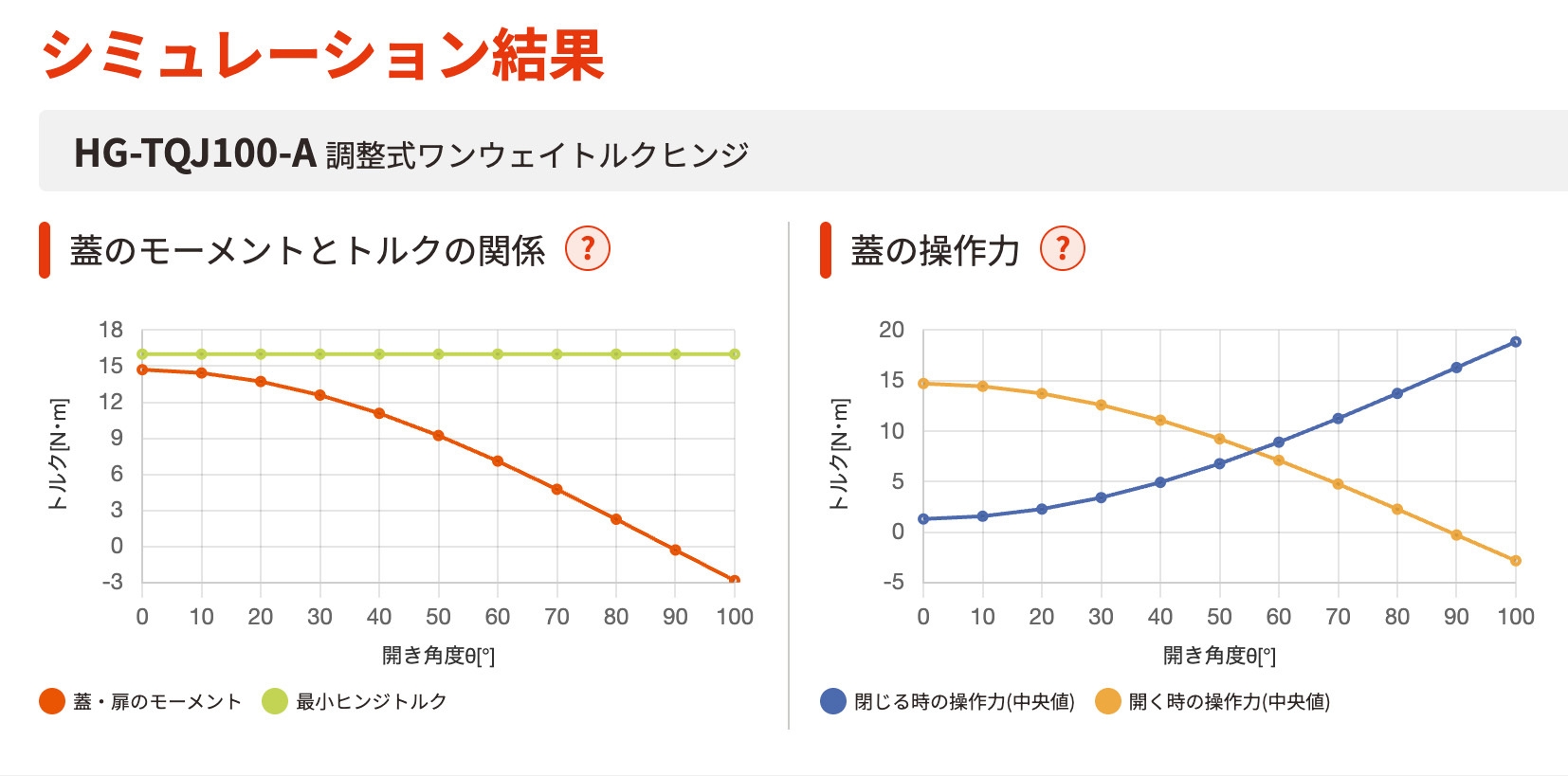 お客様が入力した蓋の条件からモーメントを計算し、使用できる製品をご提案します。フリーストップモーション、ソフトモーション、アシストモーション製品を横断した選定も可能です。