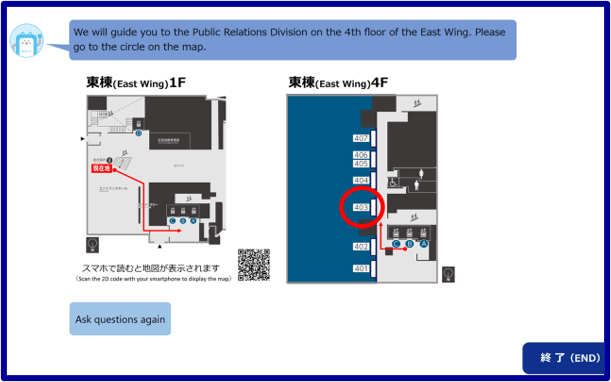 来庁した目的を伝える(話し掛ける)と、担当課・担当窓口等を音声と画面で案内します。
