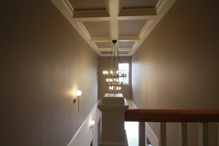 アメリカンファームハウスの佇まいに装飾的なディテールをプラス。窓枠、柱、梁、アイアン、アンティーク調の照明がクラシックな内装を演出し、温かみと個性を感じさせます。
