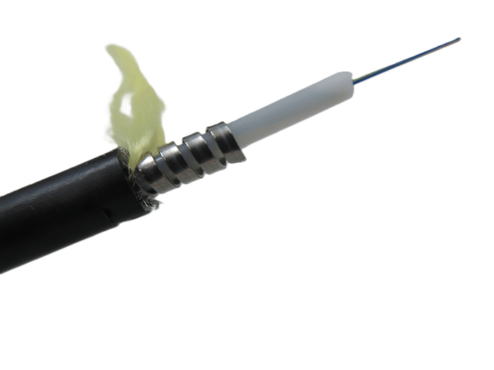ロバスト光ケーブルはステンレスモノコイルを内蔵した光ケーブルで、自動車などの踏みつけや、小動物などによる噛みつき被害から、光ファイバの断線を防ぐ堅牢・丈夫さがあります。また防水タイプは、光ファイバの周りを白いPBTチューブが覆うことで、外被が破れた際にも水が光ファイバに届かないようになっています。ファイバはシングルモード(SM)とマルチモード(OM3)がございます。