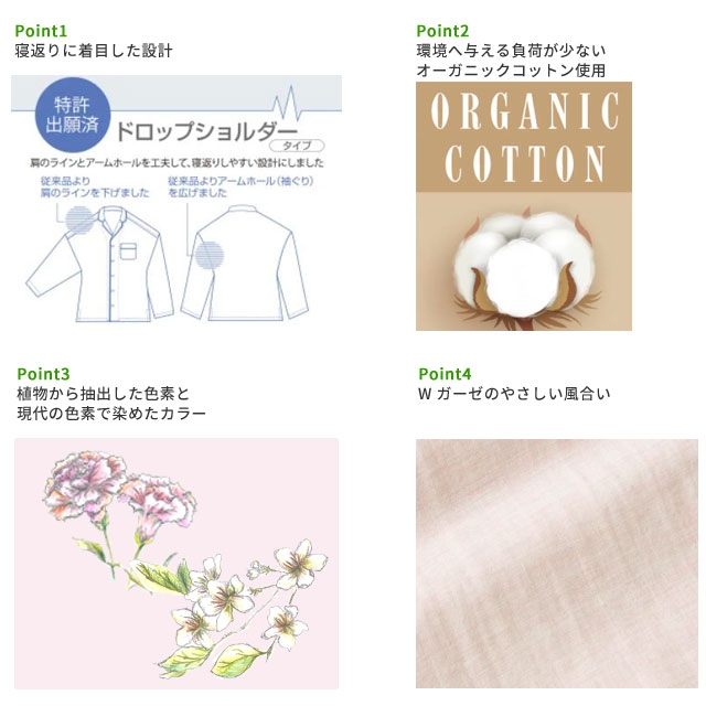 今回発売する新商品は、寝返りしやすい設計に加え、一般的な綿に比べ環境へ与える負担が少ないオーガニックコットンの糸を植物から抽出した色素と現代の色素のハイブリッドで染め、やわらかな風合いのWガーゼ素材を採用しています。婦人は、桜で染めたピンクとカーネーションで染めたサモンの2色、紳士は、ブル―ベリーで染めたブルーと竹炭で染めたグレーの2色をラインアップ。植物のもつやさしさそのままに心休まるカラーリングにしました。