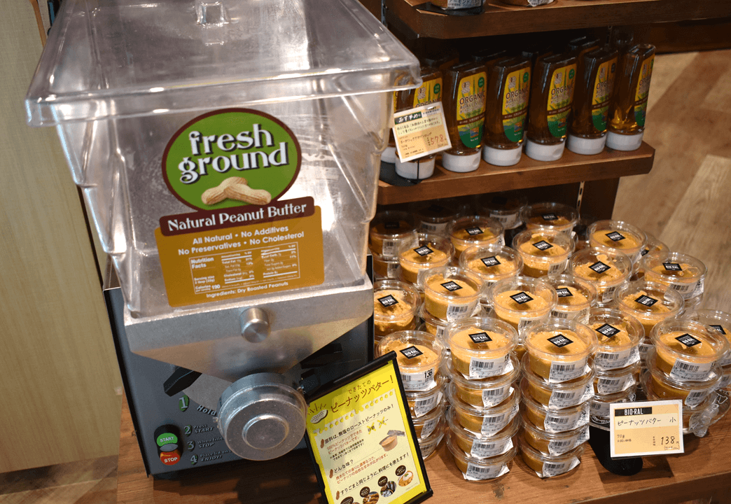 ビオラル店舗で大人気の搾りたてピーナッツバター。通常のピーナッツと有機ピーナッツの2種類をご用意いたします。