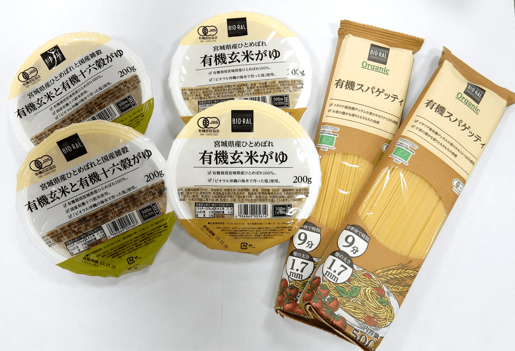 ▲左から「有機玄米と有機十六穀がゆ」・「有機玄米がゆ」・「有機スパゲッティ」
