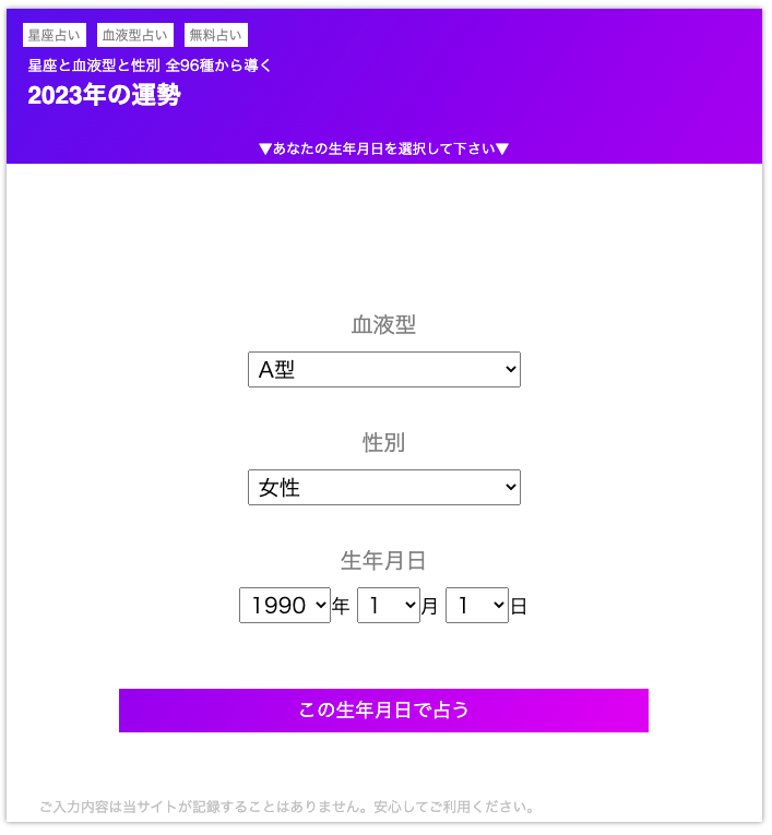 利用者は、①生年月日②血液型③性別の3点を選択することで簡単に2023年の年間運勢を占うことができます。生年月日に基づいて西洋占星術に基づいた生まれ日の太陽の位置を自動計算し、星座を導きます。加えて血液型の運勢傾向、男性女性の運勢傾向をかけあわせた計96パターンから2023年がどんな年になるのかを割り当てて結果表示します。