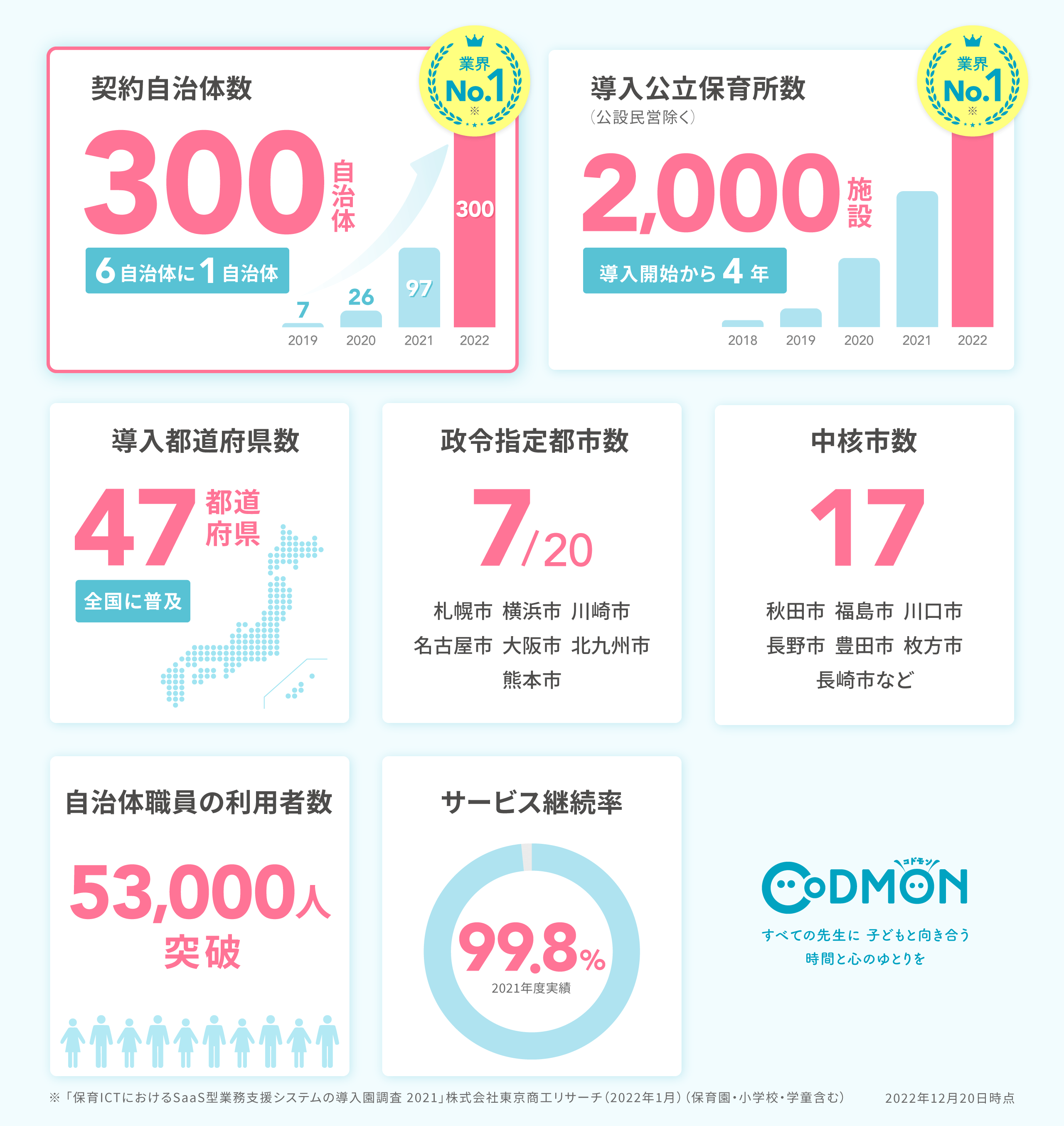 全国309の自治体にてコドモンの導入が決定しており、利用している自治体職員数は53,307人となりました。 自治体における保育・教育施設向けICTサービスでは日本最大の導入実績(※2)となっており、今後も全国自治体のDXや公立保育園の働き方改革に貢献するべく導入を展開し、2023年度から2024年度にかけて、公立保育所を保有する全国半数以上の自治体への導入を目指します。今後も子どもの育ちや学びを社会全体で支えられる世の中を実現するために、全国の自治体と共に進めてまいります。